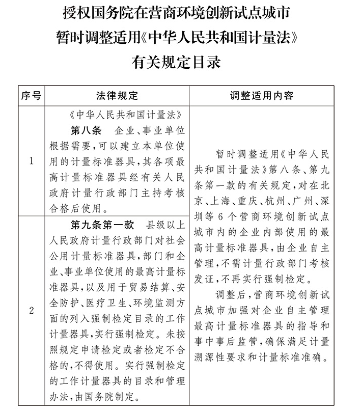 为进一步转变政府职能,优化营商环境,激发市场活力,第十三届全国人民代表大会常务委员会第三十一次会议决定:授权国务院暂时调整适用《中华人民共和国计量法》的有关规定(目录附后),在北京、上海、重庆、杭州、广州、深圳等6个营商环境创新试点城市试行。暂时调整适用的期限为三年,自本决定施行之日起算。国务院应当加强对试点工作的指导、协调和监督,及时总结试点工作经验,并就暂时调整适用有关法律规定的情况向全国人民代表大会常务委员会作出报告。对实践证明可行的,修改完善有关法律;对实践证明不宜调整的,恢复施行有关法律规定。