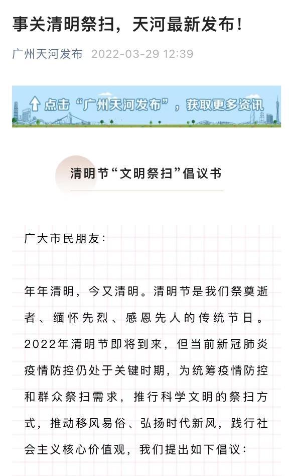 年年清明,今又清明。清明节是我们祭奠逝者、缅怀先烈、感恩先人的传统节日。2022年清明节即将到来,但当前新冠肺炎疫情防控仍处于关键时期,为统筹疫情防控和群众祭扫需求,推行科学文明的祭扫方式,推动移风易俗、弘扬时代新风,我们提出如下倡议: