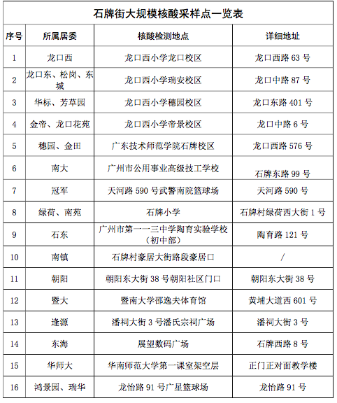 石牌街:设临时核酸检测采样点16个