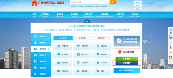 进入“天河政府网”微信公众号,点击菜单栏“办事服务”,选择“在线预约”。