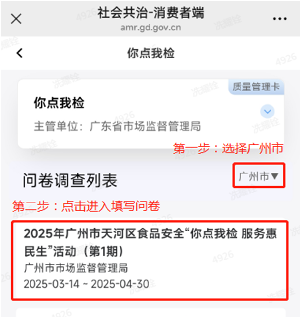 步骤二:选点问卷中的食品安全“你点我检 服务惠民生”调查问卷,进入“你点我检”意见征集页面。
