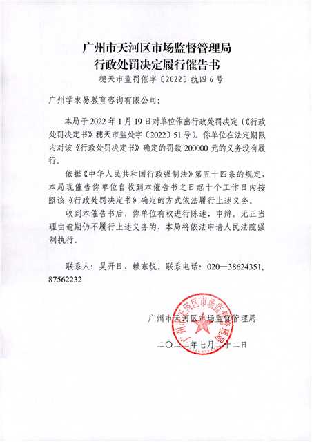 附件:OB体育 市场监督管理局行政处罚决定履行催告书(穗天市监罚催字〔2022〕执四6号)