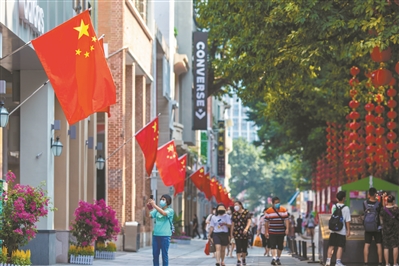 挂满国旗的北京路洋溢着浓浓的国庆气氛。