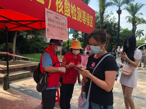 在现场,志愿者既是“信息录入员”、“秩序维护员”,也是“测温员”、“检测引导员”、“医护助理员”。顶着烈日,他们连续工作十几个小时。因为中午也正常开放检测,汗流浃背的他们匆忙扒几口饭又继续值守。