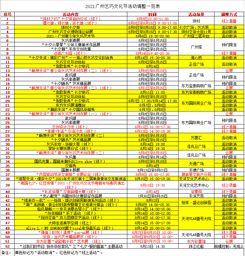 近日,记者从广州乞巧文化节组委会办公室了解到,鉴于当前全国多地出现了新冠肺炎疫情,为做好疫情防控,2021·广州乞巧文化节8月9日至15日期间举办的系列活动内容有所调整。广州乞巧文化节组委会办公室决定停止“2021年青少年艺术节”等25场聚集型演出活动,其余27场活动改为“线上为主,线下为辅”的模式继续举办。参与线下活动的广大市民需严格按照场地方预约限流的要求。