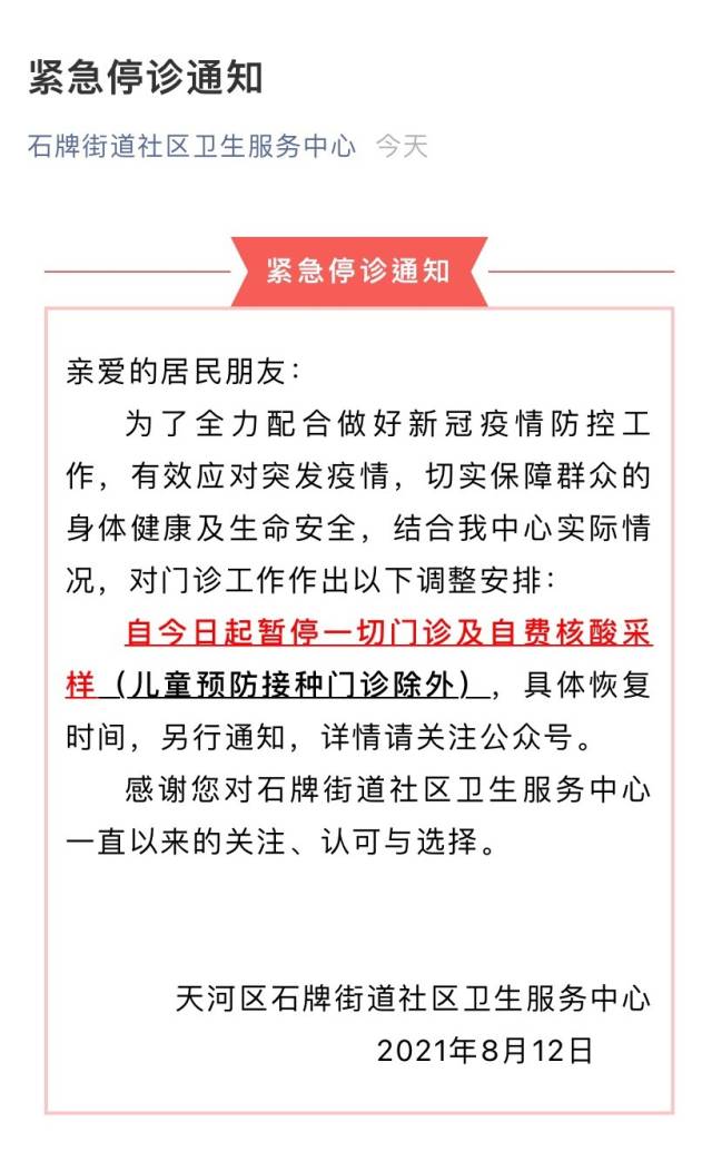 12日,广州天河多家社区卫生服务中心发布停诊通知,包括林和街社区卫生服务中心、石牌街社区卫生服务中心等。