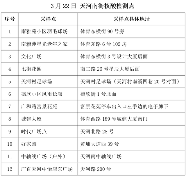 21日,记者从天河南街道办事处了解到,根据疫情防控需要,天河南街将于3月22日开展新一轮大规模核酸检测工作,并在辖内设置12个核酸检测点。天河南街表示,请各位居民积极配合,及时就近前往核酸检测点进行采样,本次核酸检测免费。