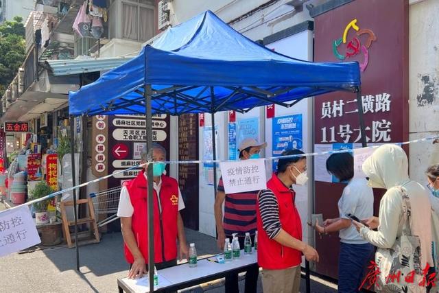 记者在员村二横路11号大院小区门口看到,小区小广场拉有警戒线,上写“疫情防控,禁止通行”。入口处,社区工作人员详细询问来访人员,防范区居民可扫码测温进入小区。