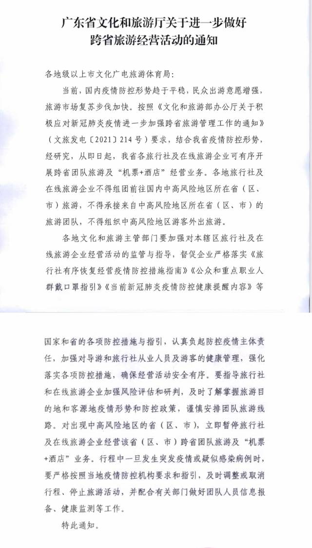 广东省文化和旅游厅今日发布《关于进一步做好跨省旅游经营活动的通知》,通知明确:从即日起,我省各旅行社及在线旅游企业可有序开展跨省团队旅游及“机票+酒店”经营业务。各地旅行社及在线旅游企业不得组团前往国内中高风险地区所在省(区、市)旅游,不得承接来自中高风险地区所在省(区、市)的旅游团队,不得组织中高风险地区游客外出旅游。